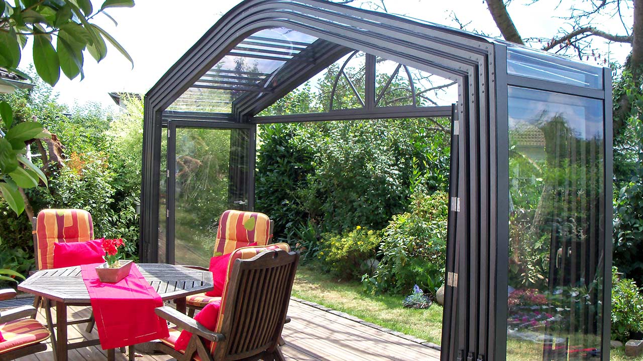 Maximale Flexibilität: Im Sommer schieben Sie die Dachelemente mit wenigen Handgriffen beiseite und entspannen unter freiem Himmel. Bei Regen oder Kälte bleibt die Überdachung geschlossen, ohne dass Sie das Gefühl verlieren, mitten im Grünen zu sein.